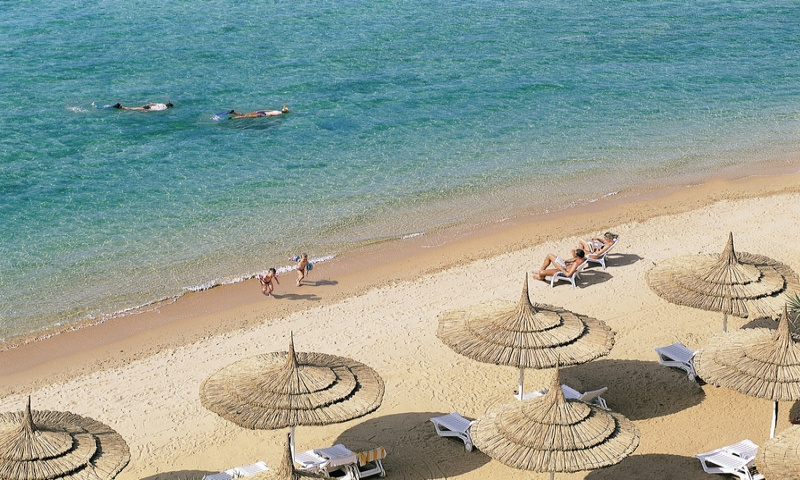 Das Reef Oasis Blue Bay Resort & Spa liegt erhöht auf einem Plateau über dem privaten, aufgeschütteten Sandstrand mit vorgelagertem Korallenriff in der Bucht von El Pasha. Über den 700 m langen Serpentinenweg oder über den hoteleigenen Aufzug gelangt man zum Strand. Der Flughafen Sharm El Sheikh ist ca. 11km entfernt und das Stadtzentrum/Ortszentrum Old Market ca. 13 km